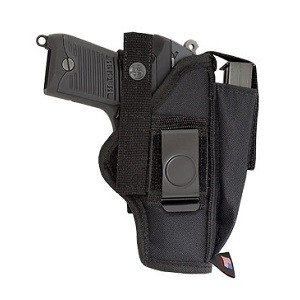 This black nylon fully lined holster is an ambidextrous belt and clip combination. Holster has an adjustable thumb break with a steel shank for quick access. There are belt loops on both sides of holster and the 2" metal clip can be moved to either side. For security, these holsters are designed to wear with the clip on the pants and the belt through the loop to insure a more stable fit.
