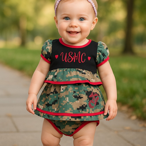 Marine Corps Infant Ruffle Dress is perfect for your Marine Cutie. This digital woodland marpat camo (official pattern of the US Marine Corps) dress has bold accents with embroidered USMC and hearts...