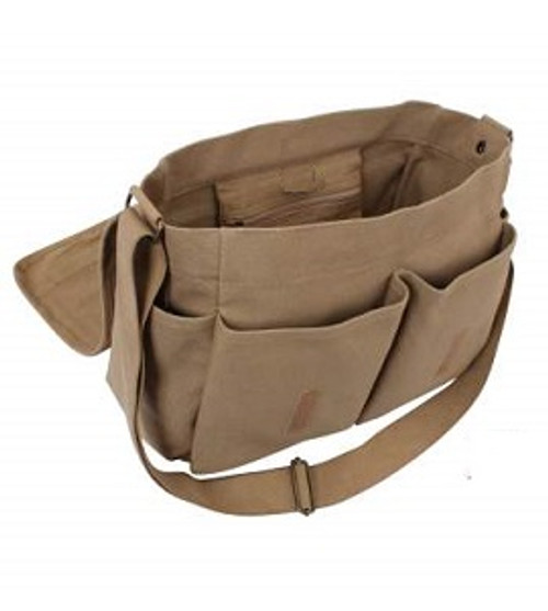Here at army surplus world we carry a stone washed messenger bag. The stone washed messenger bag is made of stone washed canvas. The stone washed messenger bag has an enormous main compartment, an inside zippered compartment, 4 outside pockets, brass hardware and a 2 inch wide adjustable shoulder strap. The stone washed messenger bag is 15' x 11' x 6'. Order your stone washed messenger bag from the army surplus superstore today.